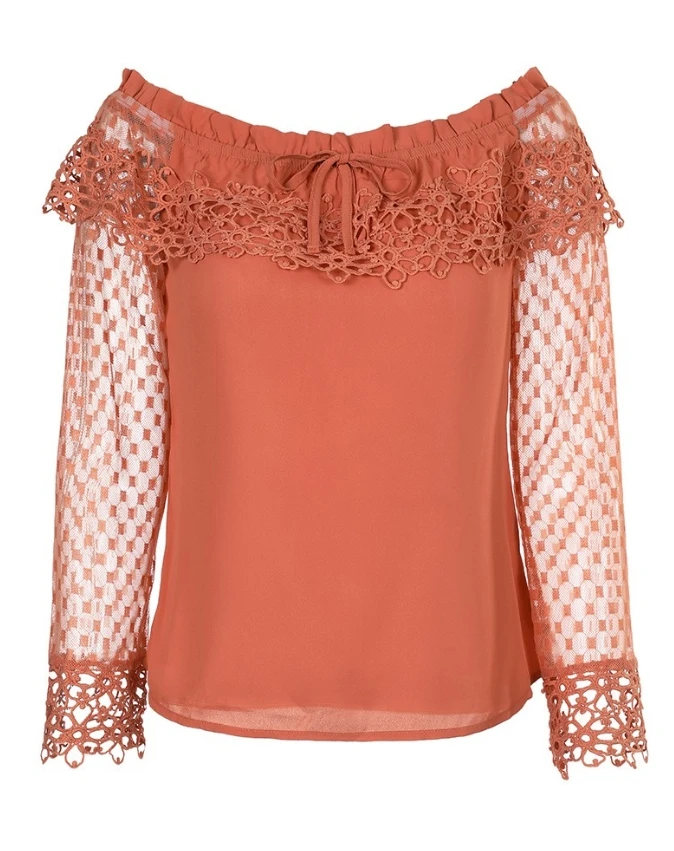Women’s Blouse Daily Casual Fashion Solid Off Shoulder Guipure Lace Frill Hem Drawstring Mesh Long Sleeve Straight Top
